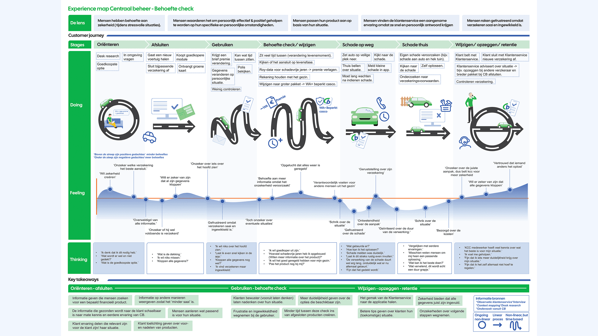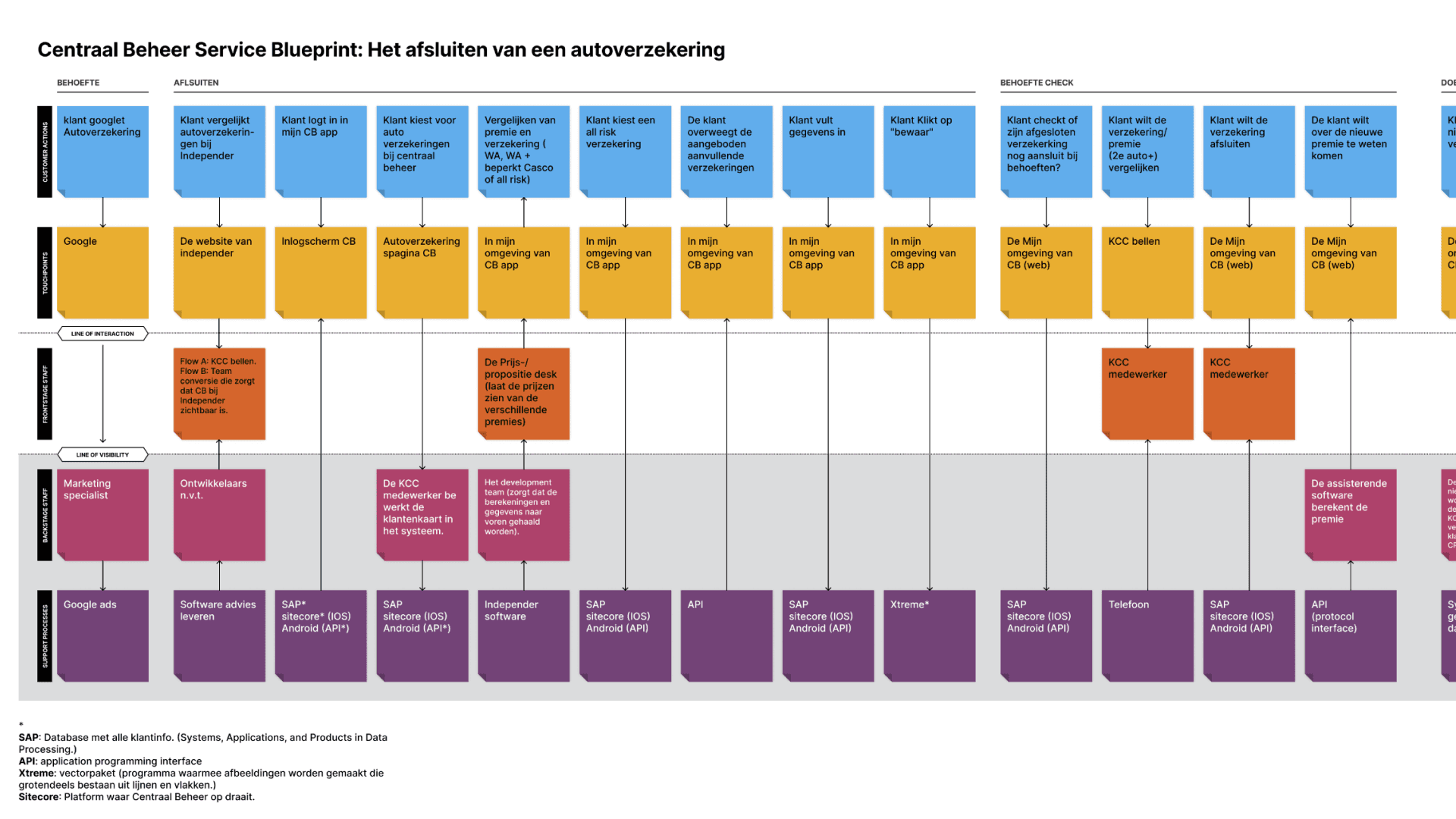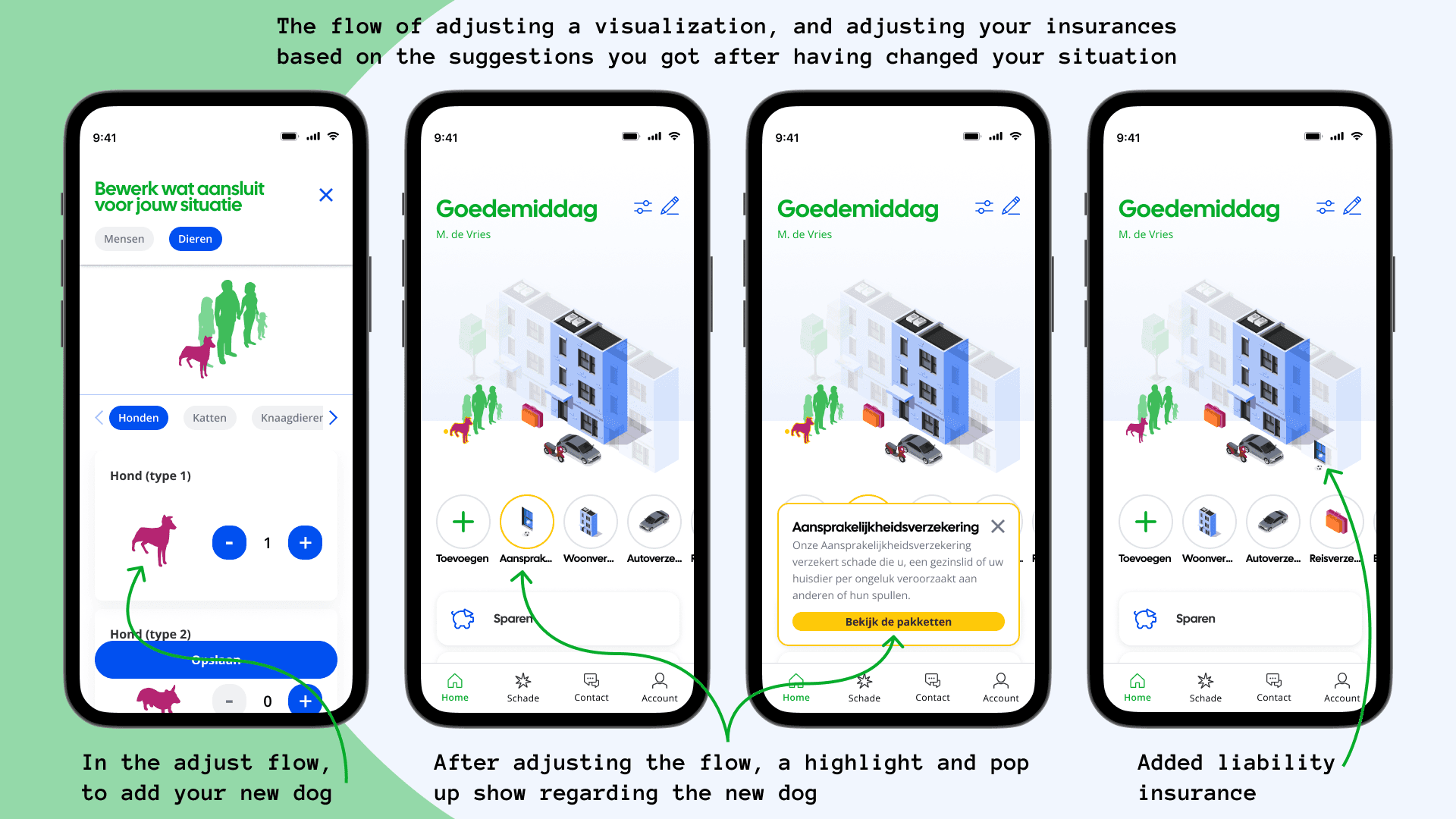 Centraal Beheer (the insurance company, and part of the Achmea conglomerate) came with the question of "how can we better support our users in periodically checking their products?". The team of: Stijn Koller, Cas Verploegen, Jill Hogenkamp, Lise Jeurissen, Max Schrijver, and myself had banded together to create the Situation Mirror/Situatie Spiegel. A way for users to get a clear overview, as well as better understand their financial and home situation. My role was doing end-to-end research, where I took the initative to faciliate key moments such as service blueprinting. As well as being the lead UX Designer in making sure the prototyping of the Situation Mirror worked properly, and was responsive.