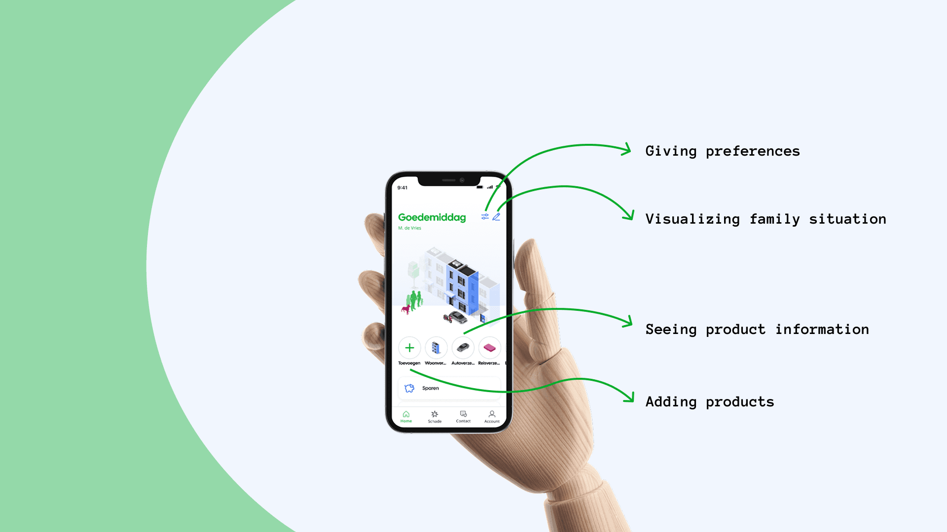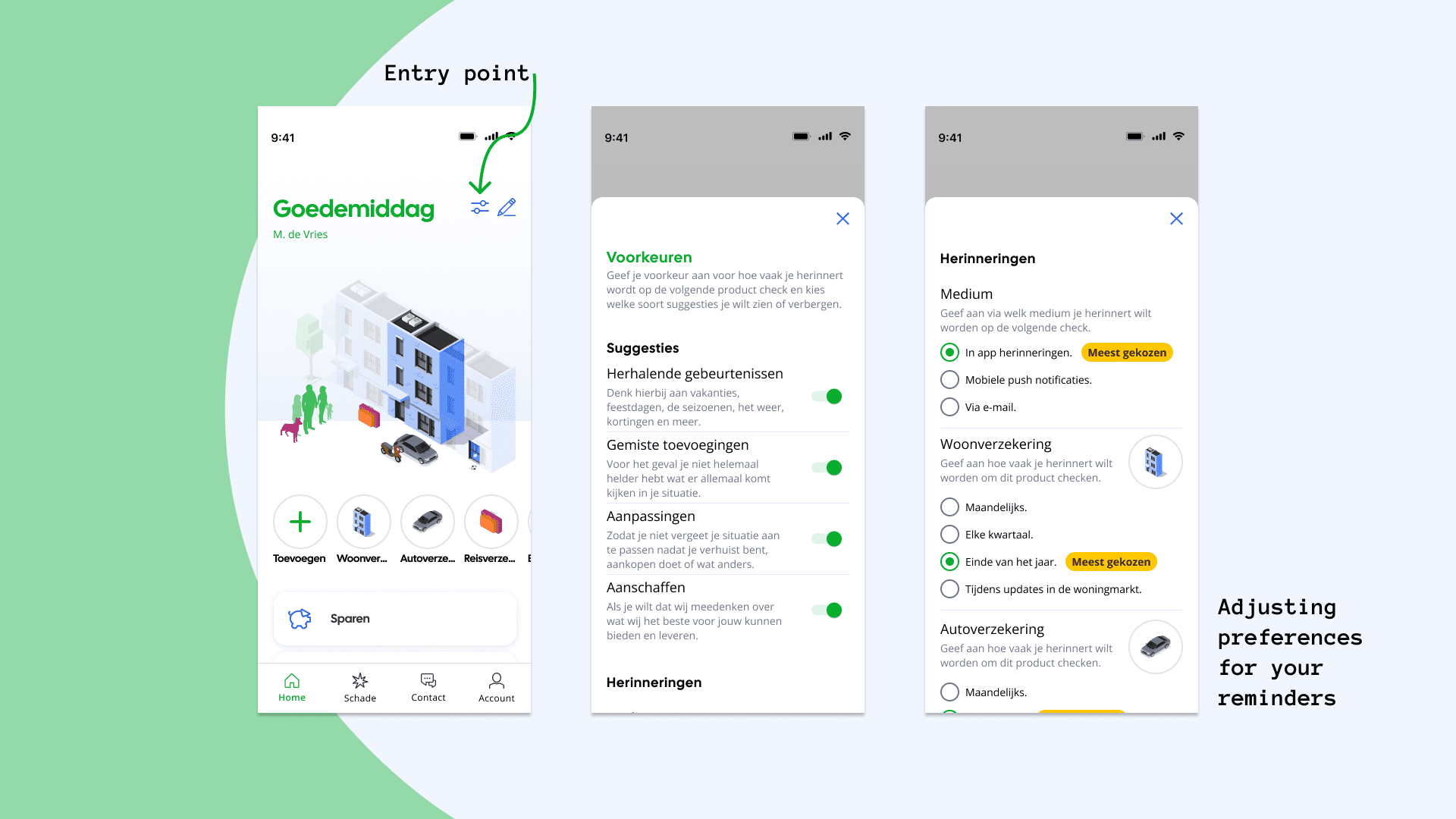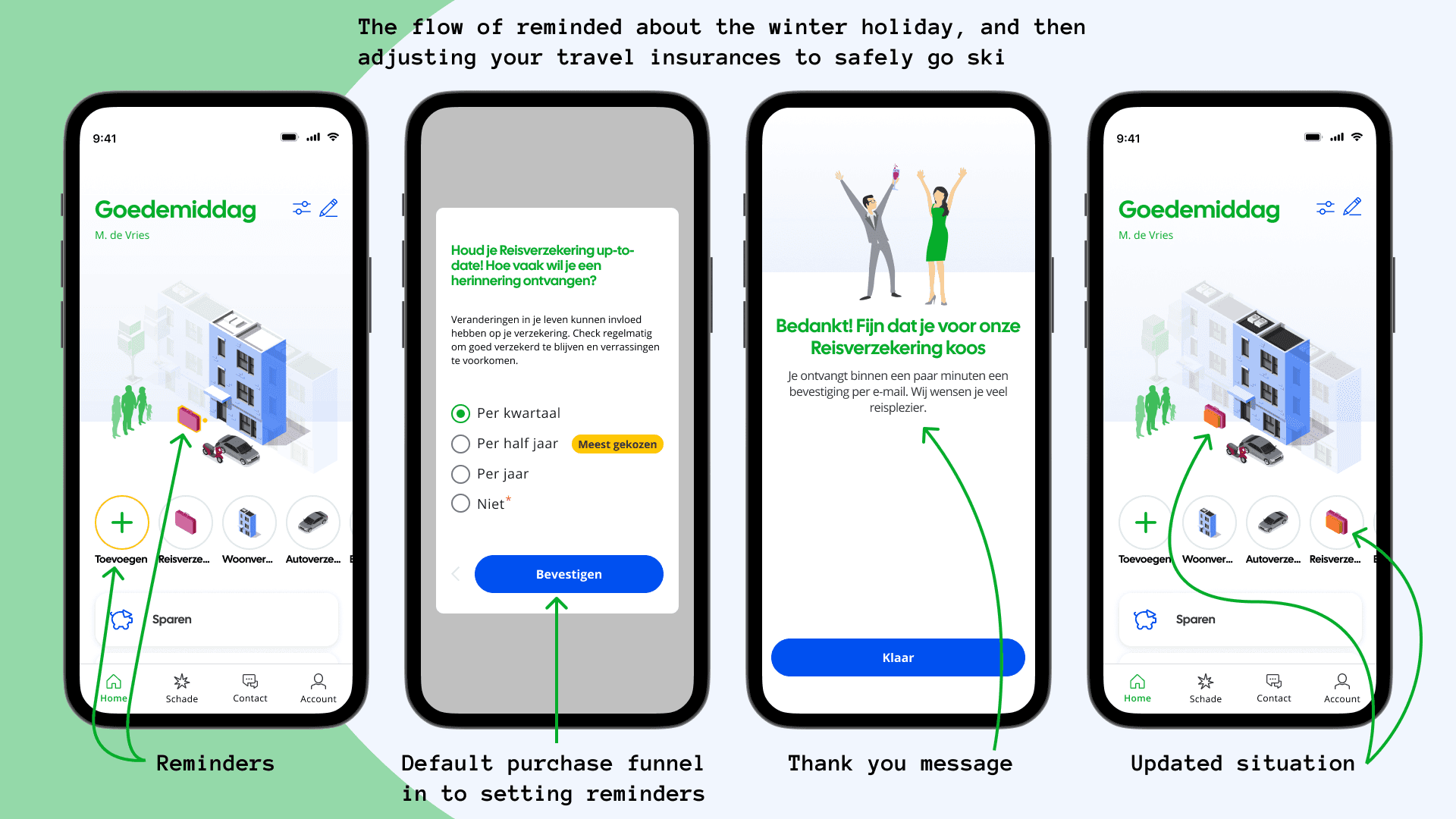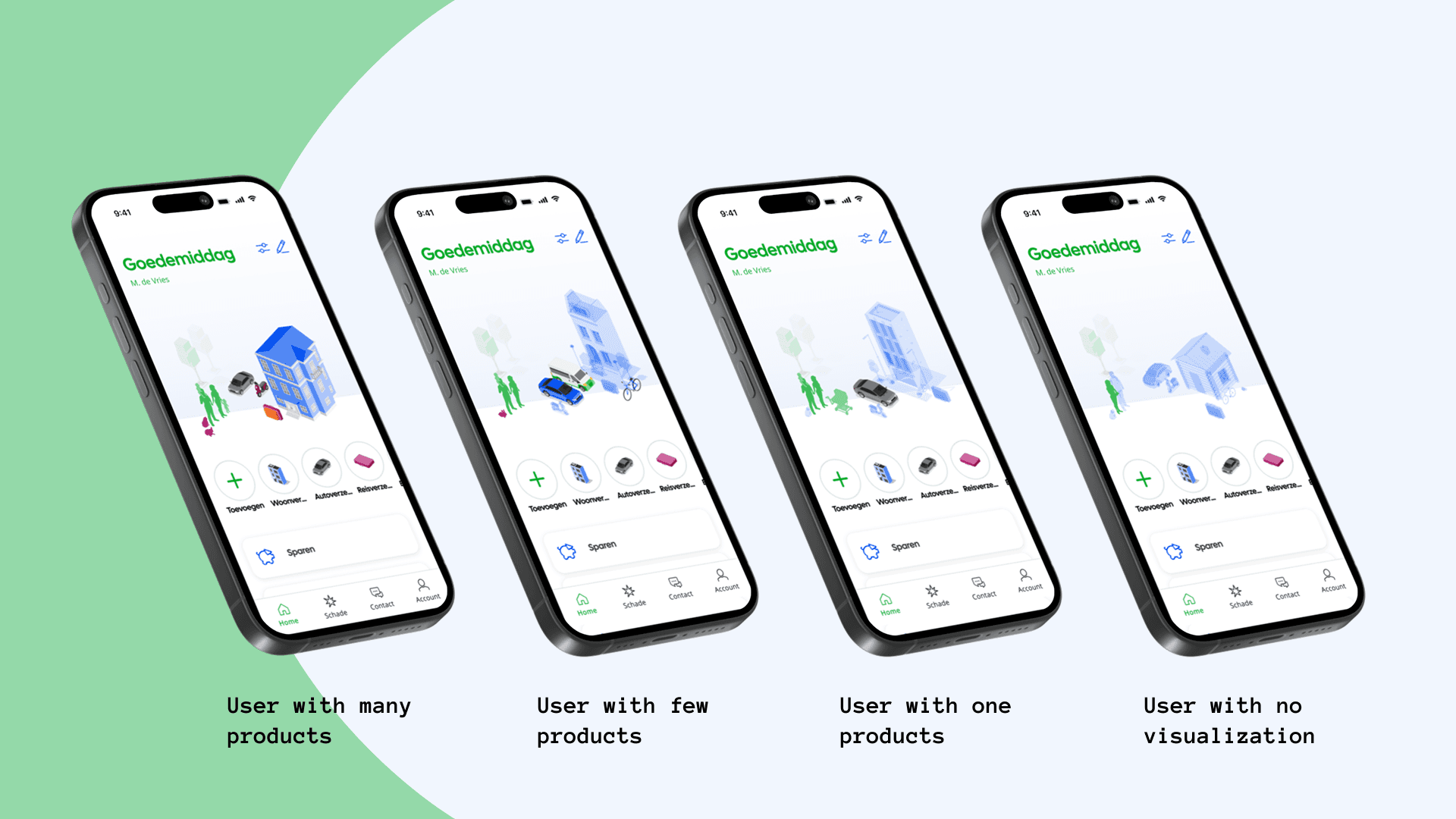 Centraal Beheer (the insurance company, and part of the Achmea conglomerate) came with the question of "how can we better support our users in periodically checking their products?". The team of: Stijn Koller, Cas Verploegen, Jill Hogenkamp, Lise Jeurissen, Max Schrijver, and myself had banded together to create the Situation Mirror/Situatie Spiegel. A way for users to get a clear overview, as well as better understand their financial and home situation. My role was doing end-to-end research, where I took the initative to faciliate key moments such as service blueprinting. As well as being the lead UX Designer in making sure the prototyping of the Situation Mirror worked properly, and was responsive.