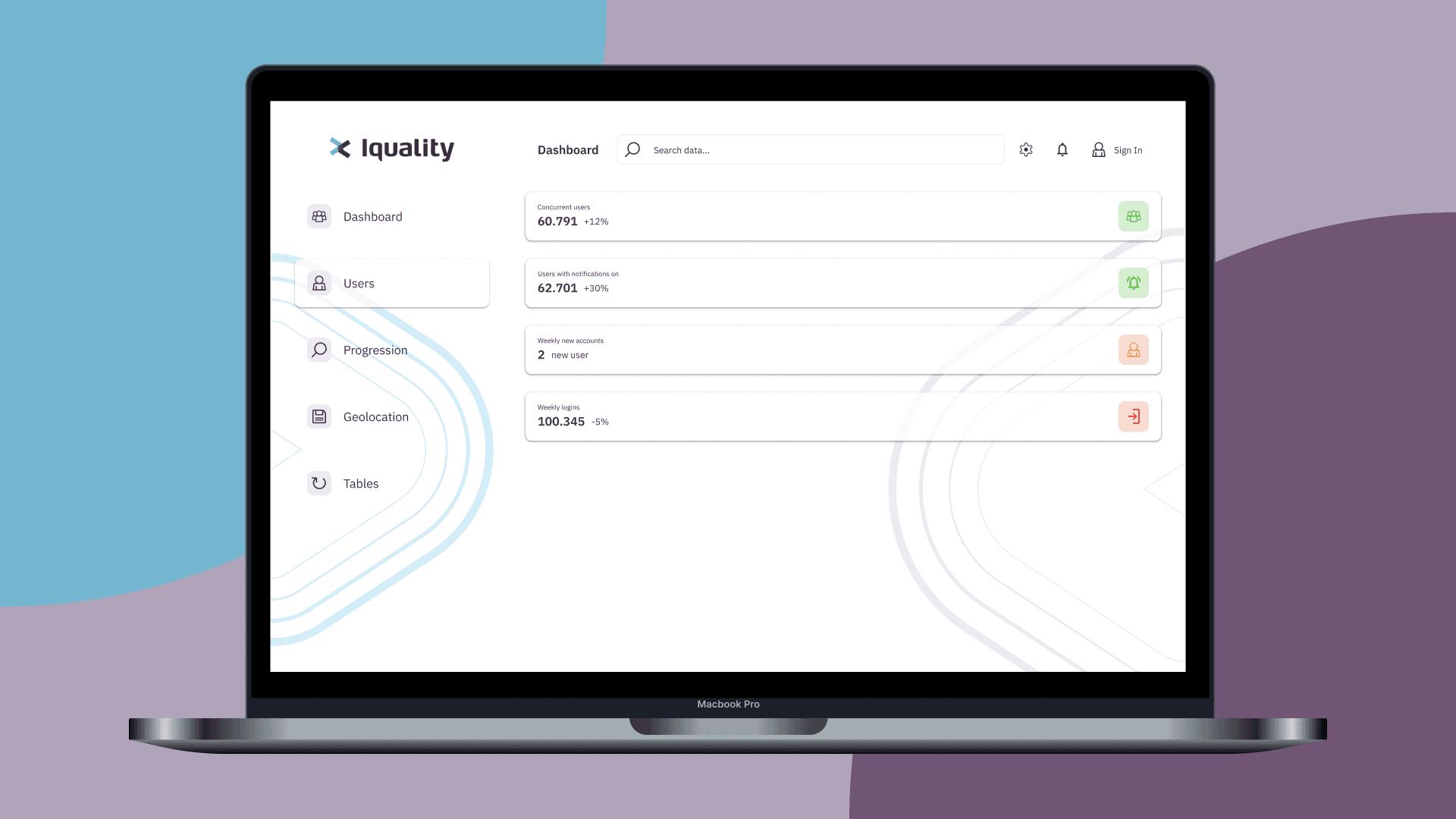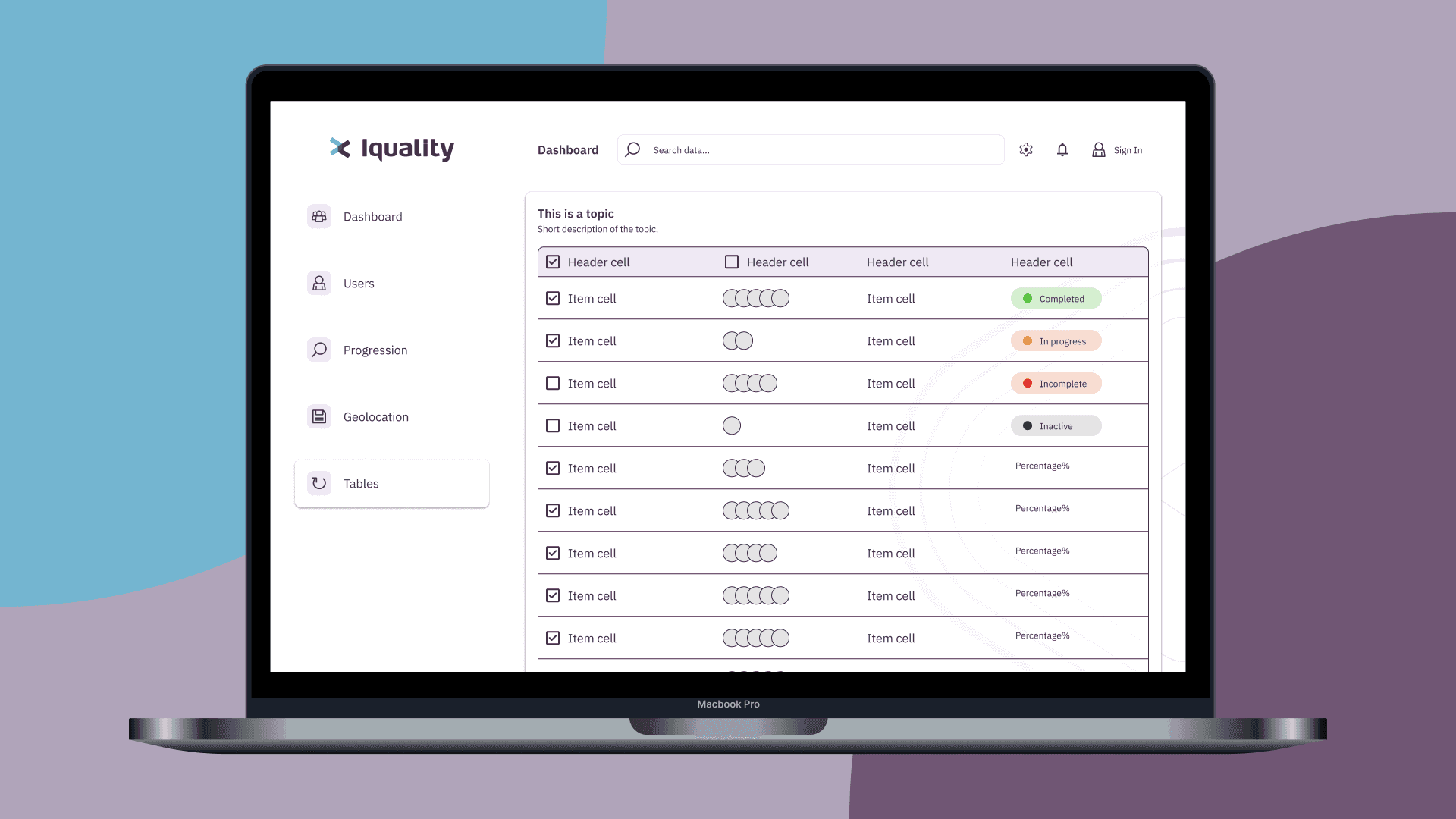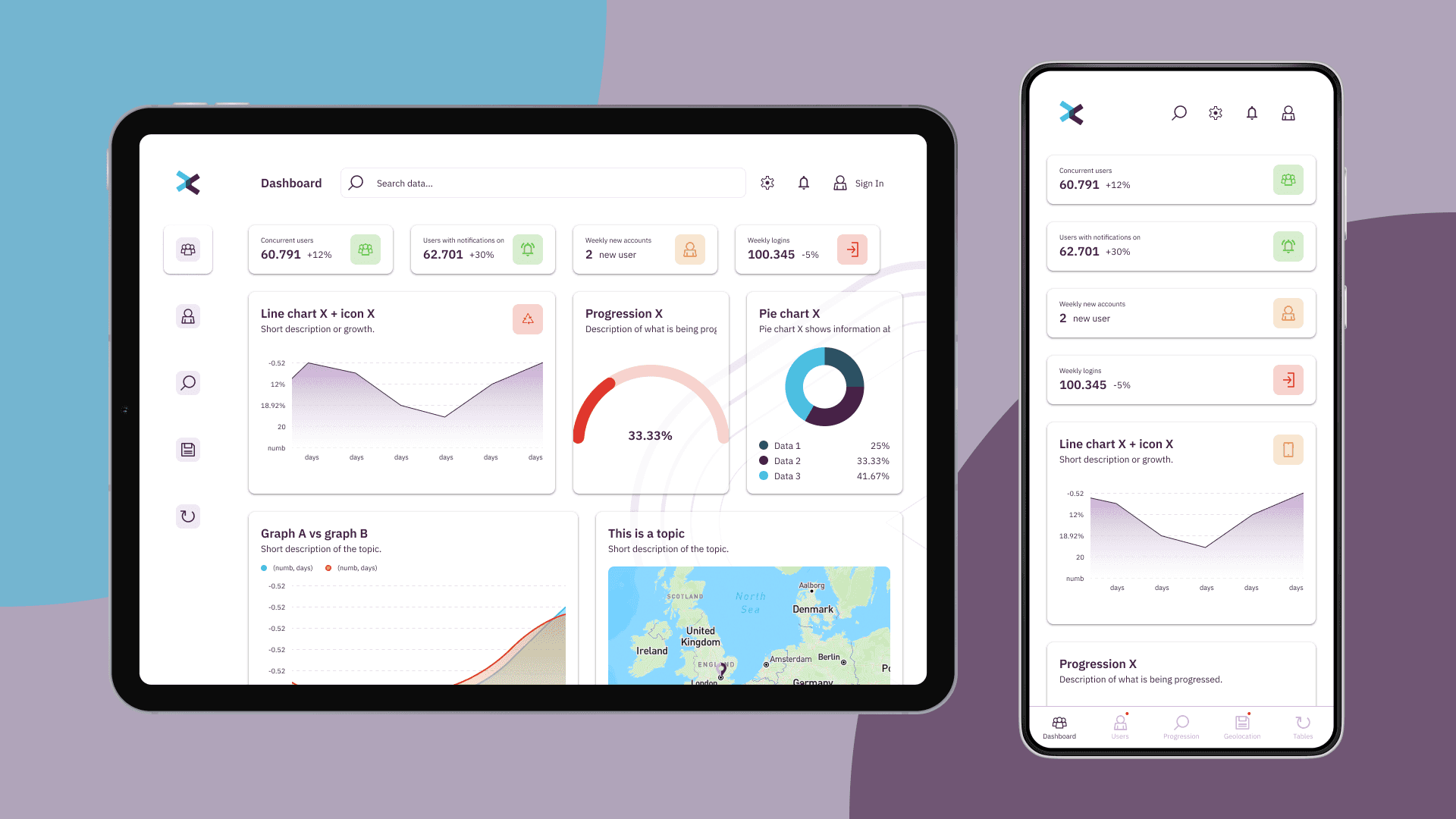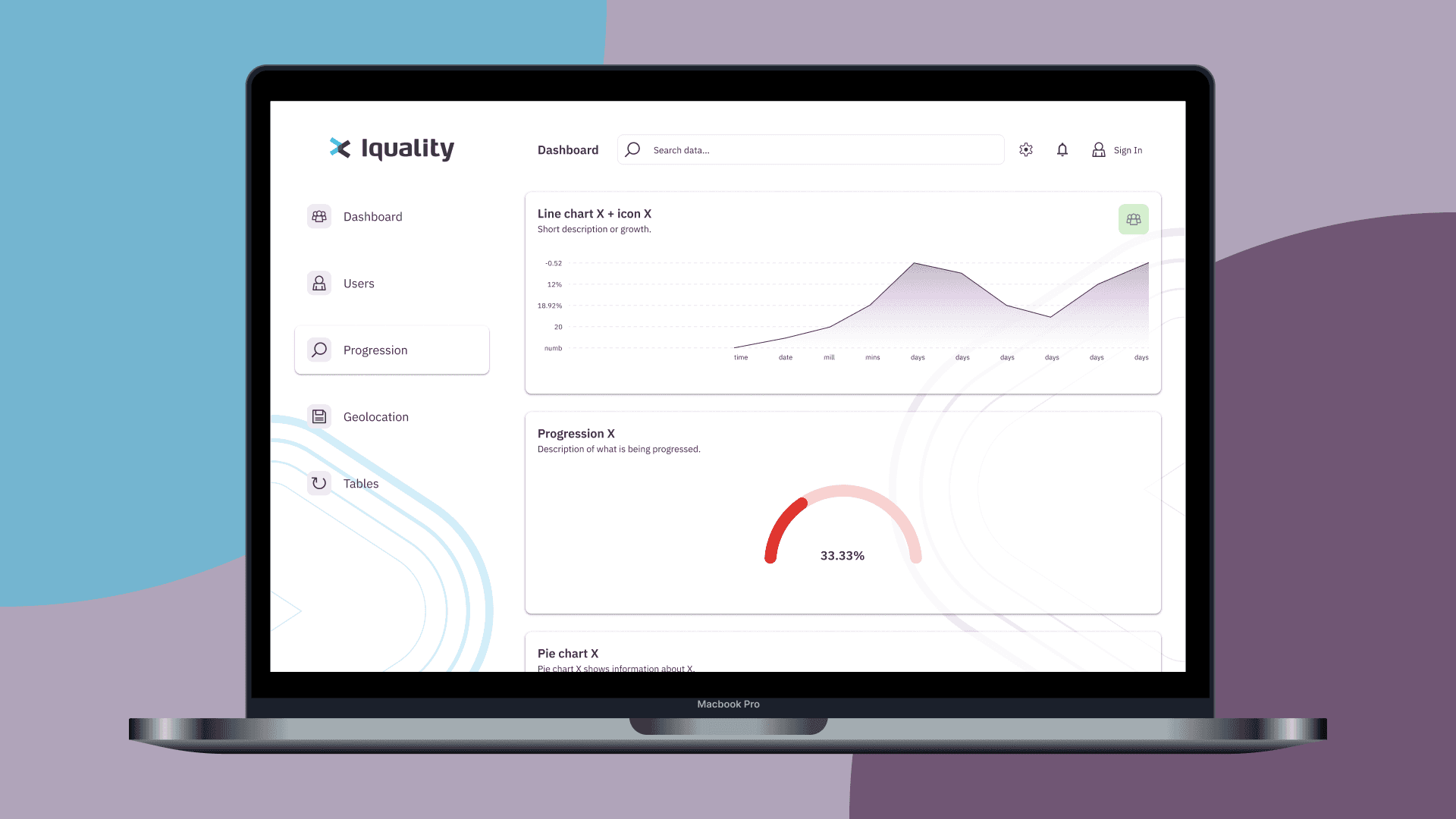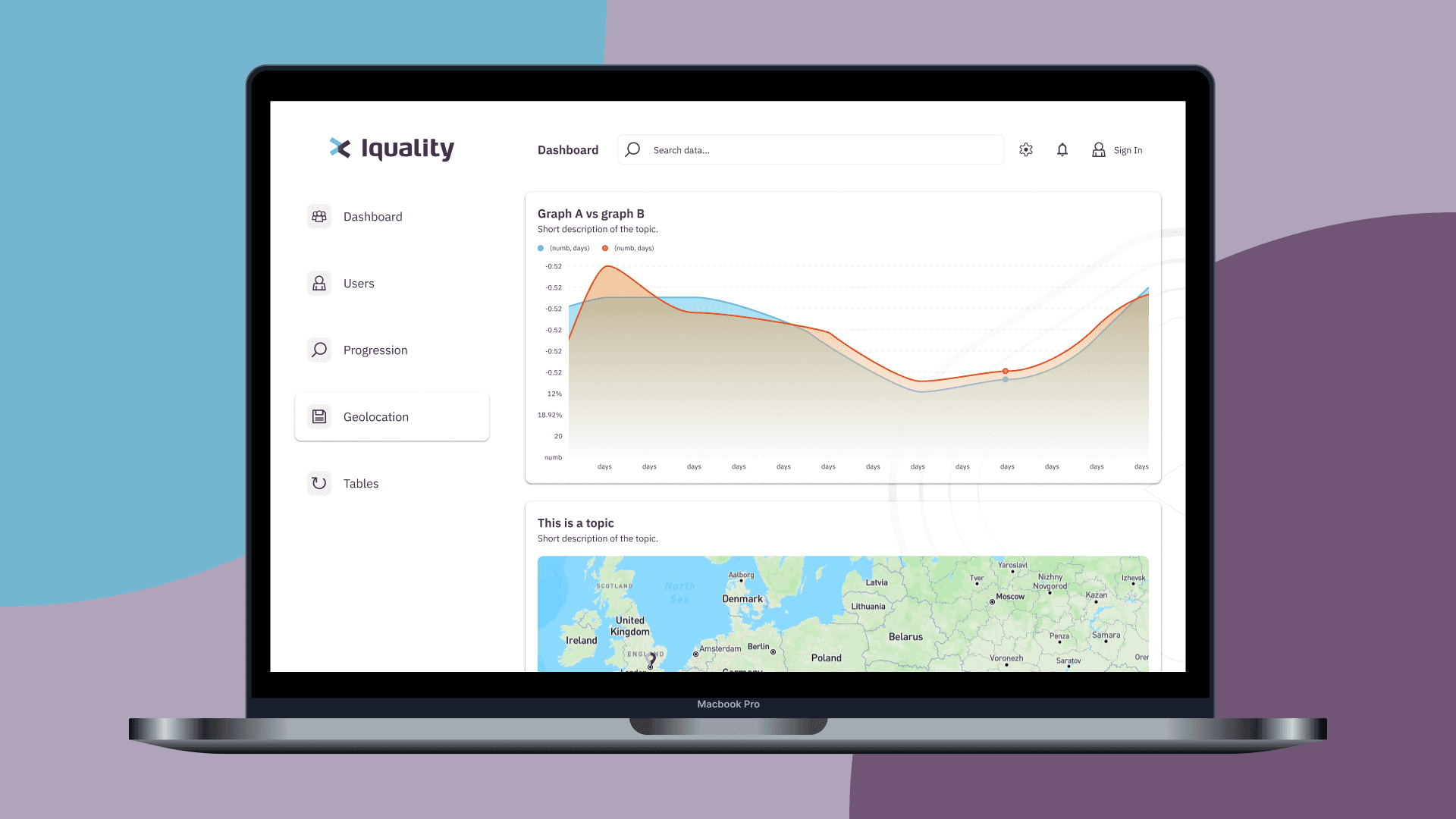 To communicate complex information with all clients, it's important to quickly be able to adjust accordingly to the situation. As a result, Iquality's dashboard has been built up on a design system, allowing for low effort changes that completely transform the look and feel of the dashboard, to give that personal touch. The dashboard itself is also modular, in the sense that making a selection of graphs and icons to show, is only a matter of choosing the correct component property, and filling the data accordingly.